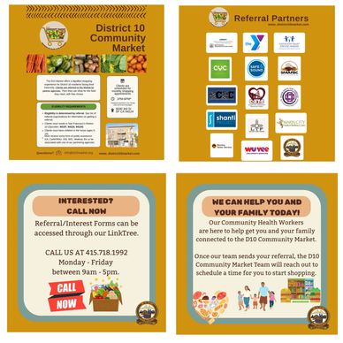 If you or someone you know needs food support, we’re here to help! We’ve partnered with the District 10 Community Market to provide FREE food services in the Bayview-Hunters Point and Potrero areas. Families can shop once a month and receive up to 65 lbs of food!